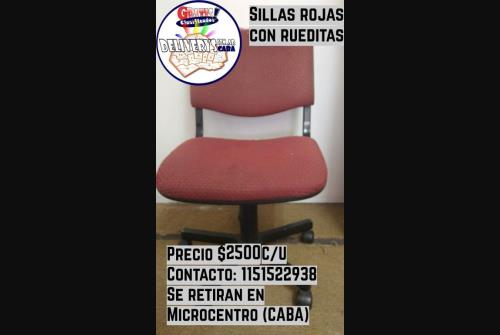 vendo sillas rojas con ruedita, ideal para oficina. son c?modas y pr?cticas. precio por unidad: $2500. me quedan 4 todav?a. se retira por microcentro (ciudad aut?noma de buenos aires...