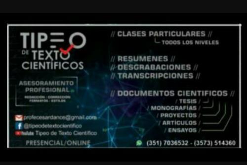 damos clases particulares (todos los niveles) y tipeo de texto cient?fico (monograf?as, tesis, proyectos de investigaci?n, etc.). presencial / online whatsapp: 3517036532 - 3573514360