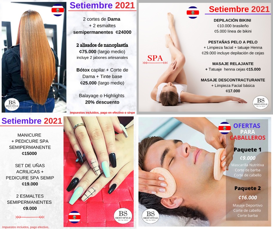 El Best Style Sal?n & Spa te ofrece una gama de tratamientos personalizados y profesionales que dar?n soluci?n a cualquier necesidad para el cuidado personal y estético en Desamparados y San José. Contamos con 8 ?reas de belleza: ?rea de peluquer?a (cortes, recuperadores, alisados, técnicas de color, extensiones), ?rea de Make- up, ?rea de depilaci?n, ?rea de maquillaje permanente, ?rea de u?as, ?rea de masajes, tienda de productos, jabones artesanales, barber?a para caballeros. Servicios disponibles en el nuevo local Citas: 8477-7181 | www.salonbeststyle.com/citas Consulta nuestras promociones y precios este Setiembre 2021